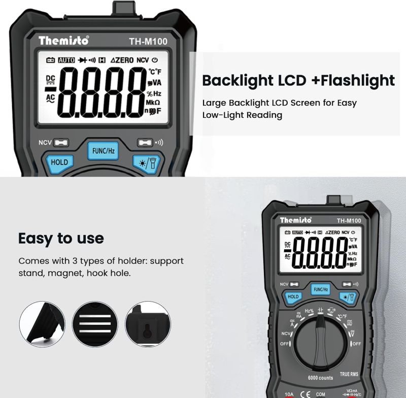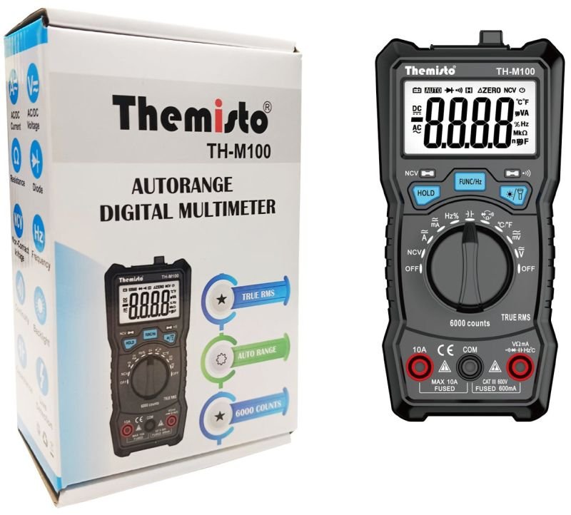 The Themisto TH-M200 Multimeter is a versatile and user-friendly digital multimeter designed for both professional electricians and hobbyists. It features a Smart Input Light Indicator, which enhances usability and safety by preventing incorrect connections. This intuitive feature lights up corresponding input jacks when the user selects a specific measurement mode, guiding the correct placement of test leads.