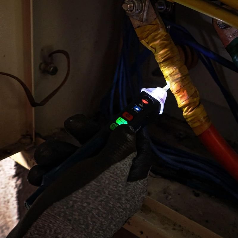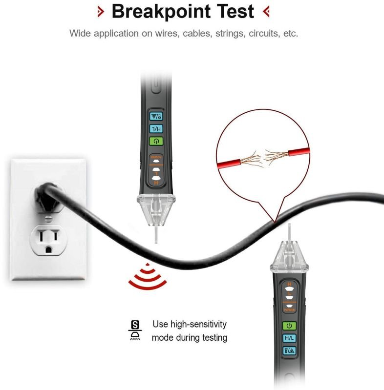 NON-CONTACT: With NCV inductive probe for AC voltage; Just place the tip near a terminal strip, outlet, or supply cord. When the tip glows red and the pen beeps, you know there 's voltage present. The live wire detector can automatically detect the live or neutral wire. Ideal for breakpoint Test. Handy circuit tester for electricians, homeowners.
