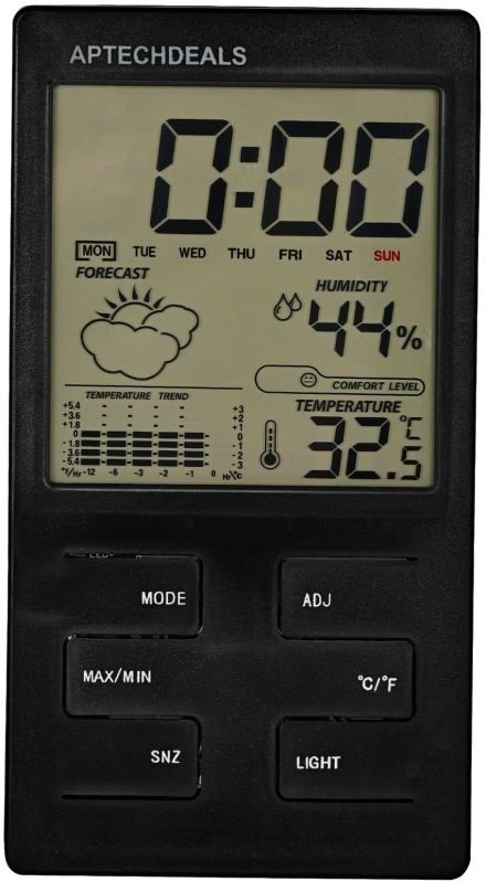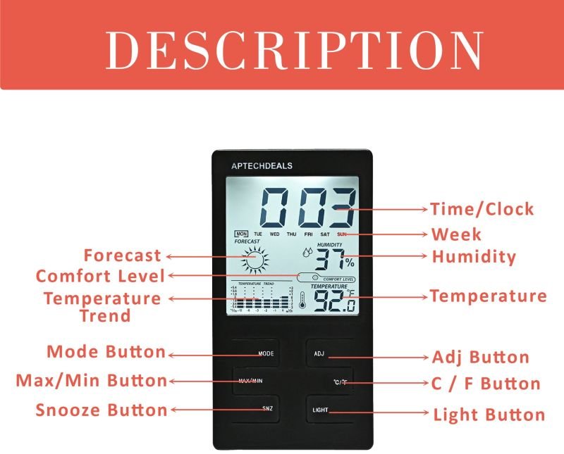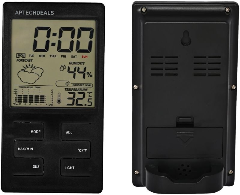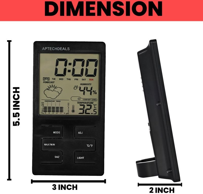 Description: Measure and display temperature and humidity at the same time. Temperature can be displayed in Celsius(°C) or Fahrenheit(°F). Max and min temperature and humidity display. Clock display, 12/24 hour conversion. Show you time, date, month and week, and you can set time, date, month, year by yourself. With alarm, hourly chime function, comfort level, weather, temperature trend indication, really practical. With a bracket, it can be placed on the table. With a hanging hole, it also can be hung on the wall. Portable design is perfect to use in bedroom, kitchen, office and workshop or on travel.